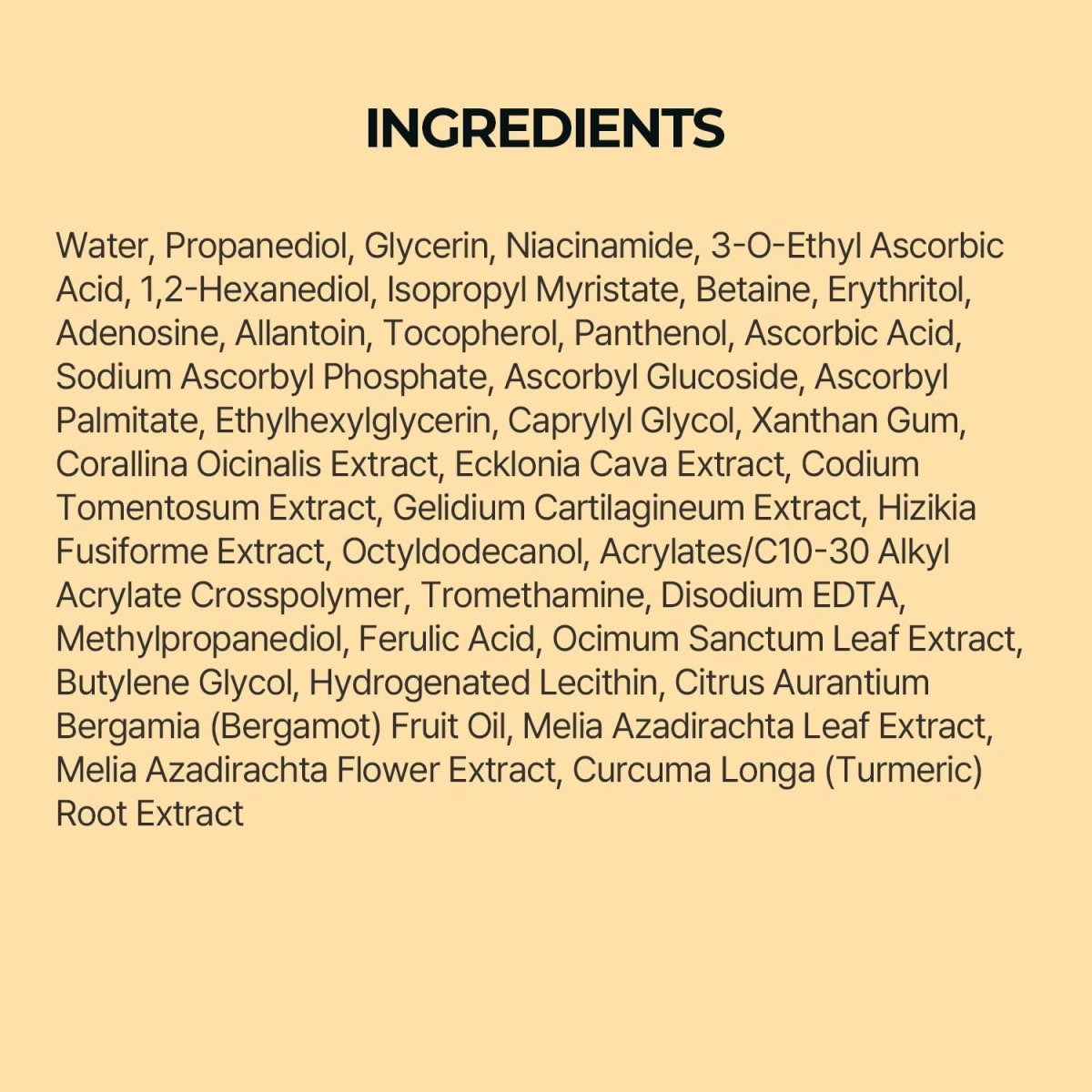 Water, Propanediol, Glycerin, 1,2-Hexanediol, Xanthan Gum, Niacinamide, Adenosine, Betaine, Erythritol, Disodium EDTA, Allantoin, Panthenol, Acrylates/C10-30 Alkyl Acrylate Crosspolymer, Isopropyl Myristate, Caprylyl Glycol, Ethylhexylglycerin, Tocopherol, Tromethamine, Methylpropanediol, Ferulic Acid, Melia Azadirachta Leaf Extract, Melia Azadirachta Flower Extract, Curcuma Longa (Turmeric) Root Extract, Ocimum Sanctum Leaf Extract, Corallina Officinalis Extract, Butylene Glycol, Ecklonia Cava Extract, Hizikia Fusiforme Extract, Codium Tomentosum Extract, Gelidium Cartilagineum Extract, 3-O-Ethyl Ascorbic Acid, Citrus Aurantium Bergamia (Bergamot) Fruit Oil, Hydrogenated Lecithin, Ascorbic Acid, Sodium Ascorbyl Phosphate, Ascorbyl Glucoside, Ascorbyl Palmitate, Octyldodecanol